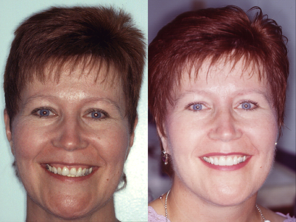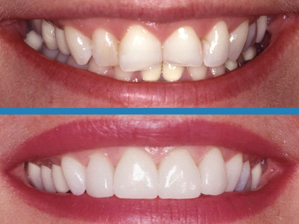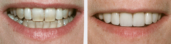 Veneers can be used to change the color of teeth. This patient was given tetracycline (an antibiotic) during childhood which resulted in these dark stains deep inside her teeth. In this case, bleaching alone was not enough to lighten her teeth.