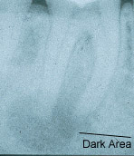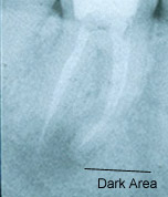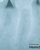 The radiograph (x-ray) series below shows an example of the root canal process. This patient initially presented with infection and pain but had immediate relief of symptoms following the first visit. Complete healing is noted on the one-year root canal followup radiograph (x-ray). The healing is evidenced by an absence of a dark area around the root tips, indicating that new bone has grown in the area of previous infection. The very white area inside the roots is the root canal filling material which is gutta percha, a derivative of a South American gum tree. This material is commercially packaged as root canal filling material and is recommended by the University of Connecticut Dental School.